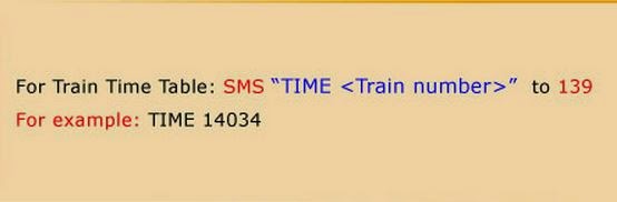 There is another method of getting the train timings and its route. This is by sending 'sms' from mobile phone.To get train timetable by sms message use one of the following methods -