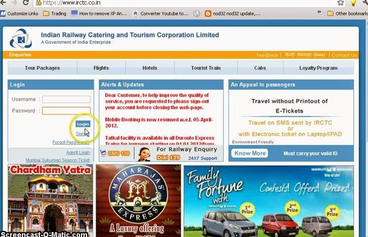 First the user has to create a free account on 'irctc.co.in'. How to open account? Simply follow instruction on irctc registration for online ticket booking page. Any registered user then login to irctc to do reservation. Login is done when the user id and password entered by the user is authenticated by the system. Upon successful login, reservation can be done in any train of railway online.
