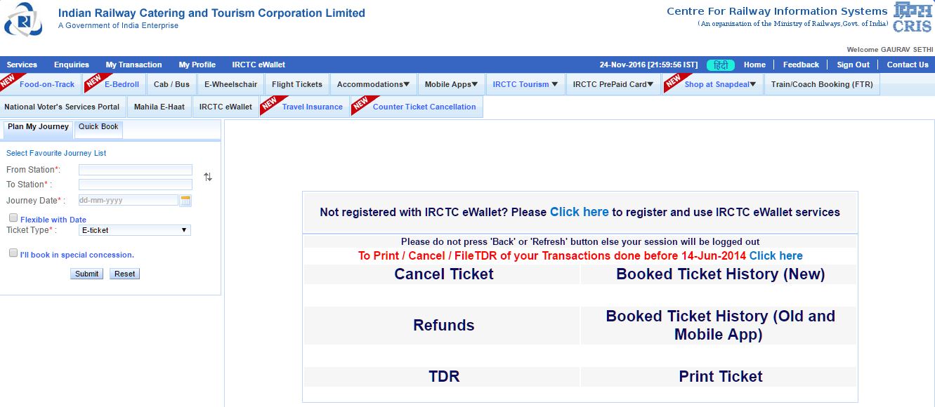 As you can see that not only you can book railway tickets using 'Plan My Journey' on E-Ticketing page, you can also cancel ticket, print ticket (not recommended as you can use the message sent on your mobile phone along with ID proof in place of ticket), and see status of refund, as well as go and see the booked ticket history on the same page. Hence it is easy to work with, exactly what the new generation likes, and there is no need to navigate from one page to another for performing different tasks.