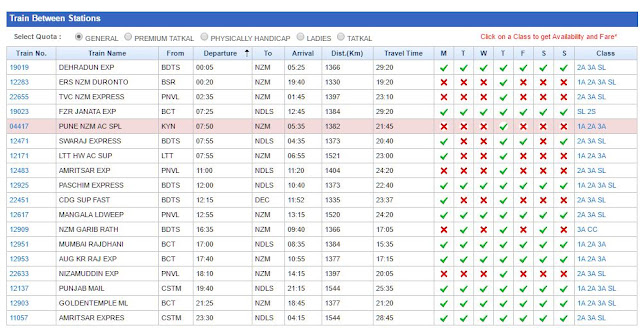 As expected, our search for trains returned list of trains with related information details about each train viz(train name, number, travel class available, arrival/departure time, and weekdays on which a train runs). But there was something very interesting which we never saw before. Few rows had a background color other than 'white'. You can see 'pink' color in snapshot above.